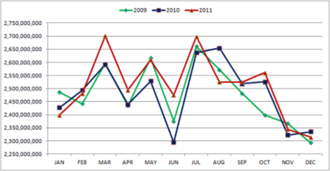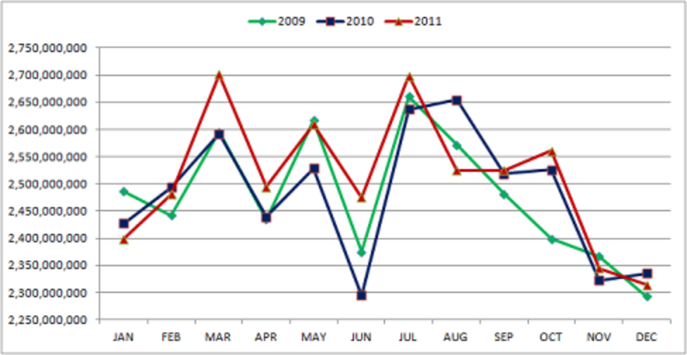 Take a look at this chart… the data reported by State Gaming Commissions from across the United States shows a clear cyclical annual patterns in play based on annual life events such as tax returns, paying for Christmas gifts, and taking vacations in the summer.